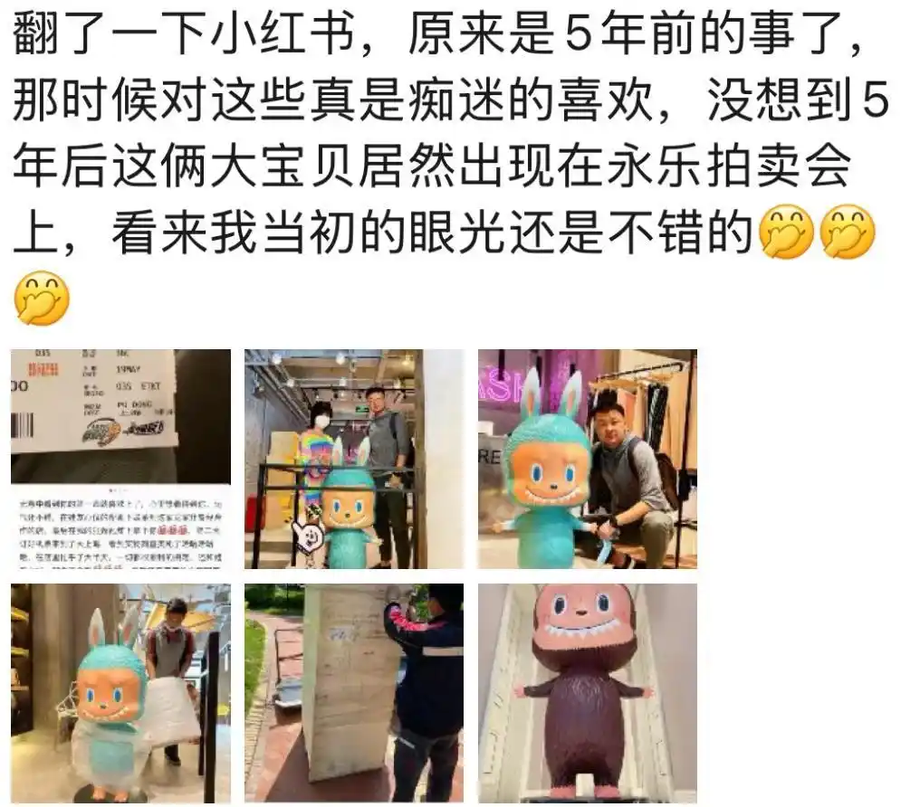 “薄荷色Labubu拍卖价108万”的消息传出后,6月10日晚,“宁静致远”发文称,当天有很多“娃友”发私信告诉他这个重磅新闻,“曾经的两个小宝贝去永乐拍卖了,回想当初去买的情景还是非常有意思的。5年了,曾经的小宝贝已经变成火遍全球人见人爱的大宝贝了。”